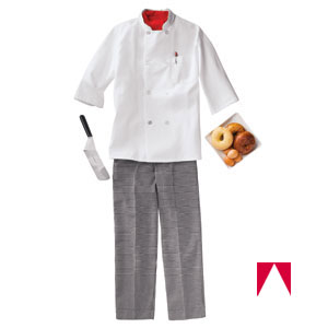 Unisex Garnish Chef Coat in 65% Poly/35% Cotton. White chef coat garnished with black cuffs, collar and 10 black pearl buttons. Vented cuffs. Read More